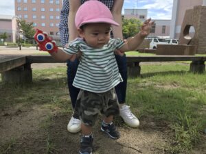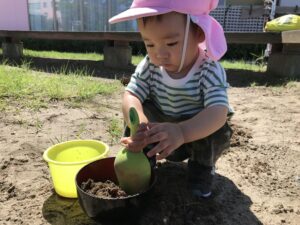 歩行ができるようになり、好きなところ歩いたり、年上のお友だちの真似をして砂あそびを楽しむ0歳児さん。
