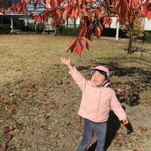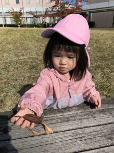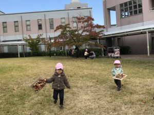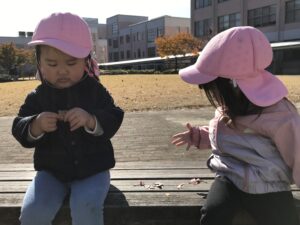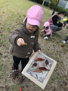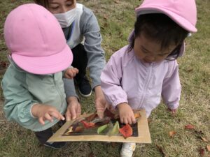 「これはオレンジ色っぽいね」など様々な色を伝えるとワクワクしながら落ち葉拾いを楽しむ乳児クラスのお友だち😊