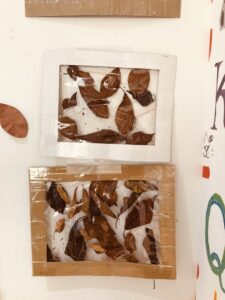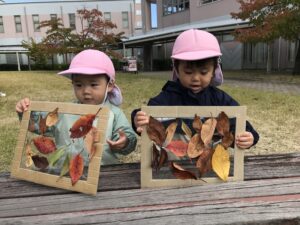 拾った落ち葉を透明テープがついた厚紙の額にペタペタと貼り、色鮮やかで美しい落ち葉を絵画風にしましたよ!
