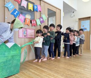 11月のお誕生会で『おおきなかぶ』の劇を観たり、その劇に参加して一緒にかぶ抜きを楽しんだりした乳児クラスのお友だち。