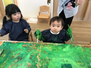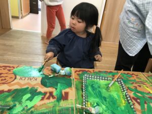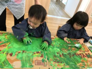 大きな段ボールに緑、黄緑、黄色を筆や刷毛、スポンジ、たんぽを使って色塗り。