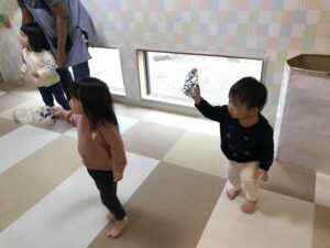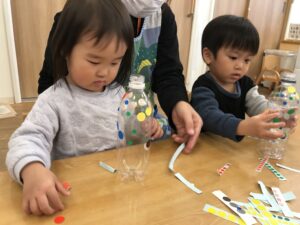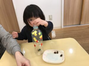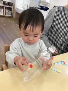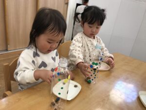 指先をよく使ってシール貼りも、どんぐり入れも集中して楽しんでいました!