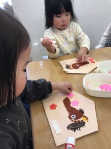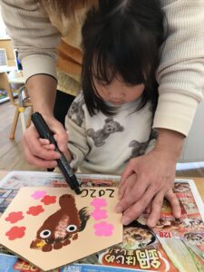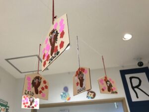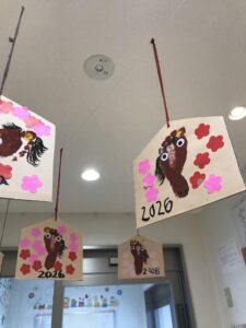 玄関には乳児クラスのお友だちが作った絵馬が飾られていますよ✨